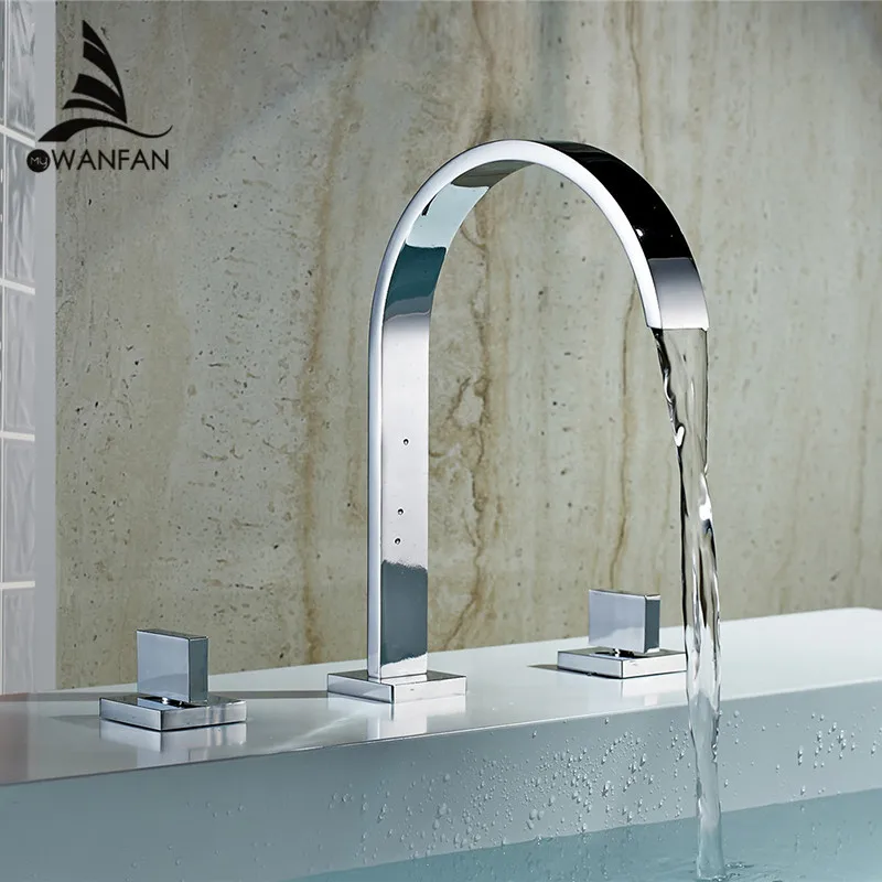 Basin Faucets Brass Polished Chrome Deck Mounted Square Bathroom Sink Faucets 3 Hole Double Handle