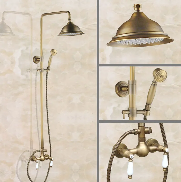 Vintage Retro Antique Brass Wall Mounted Bathroom 8.2" Round Rain Shower Head Faucet Set Dual Ceram